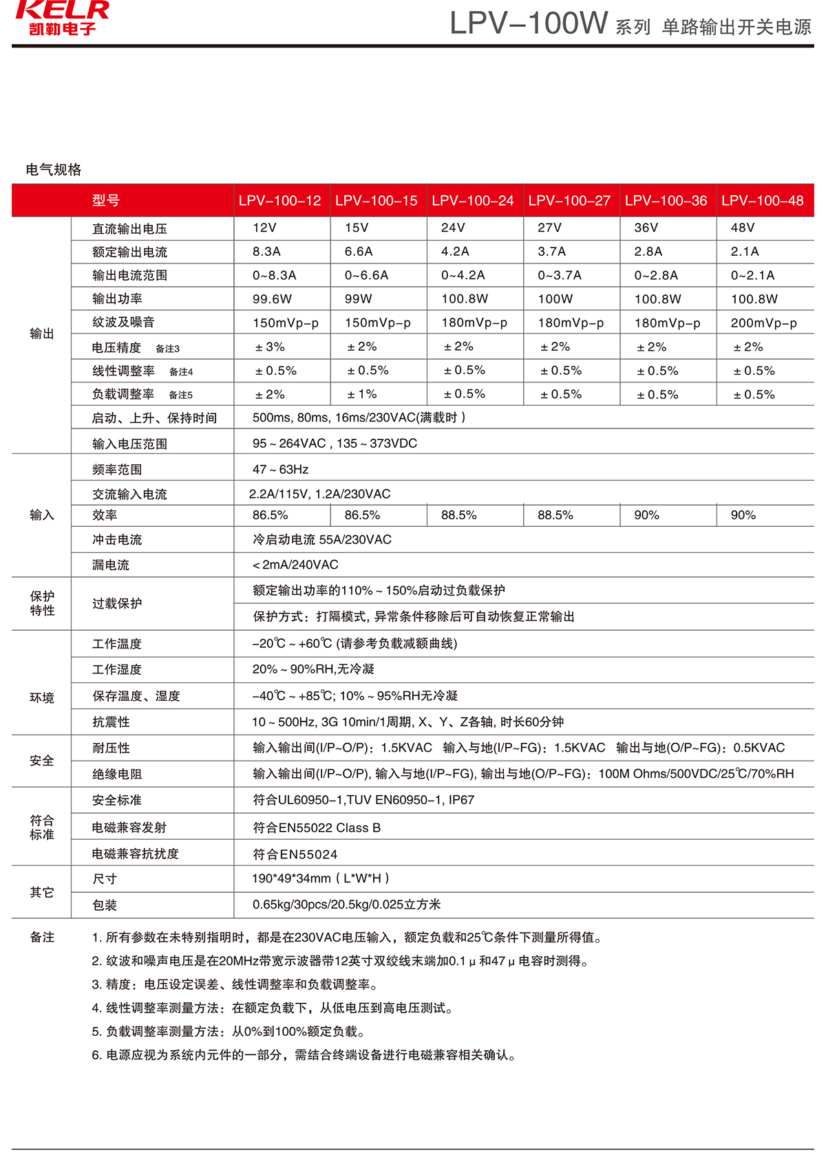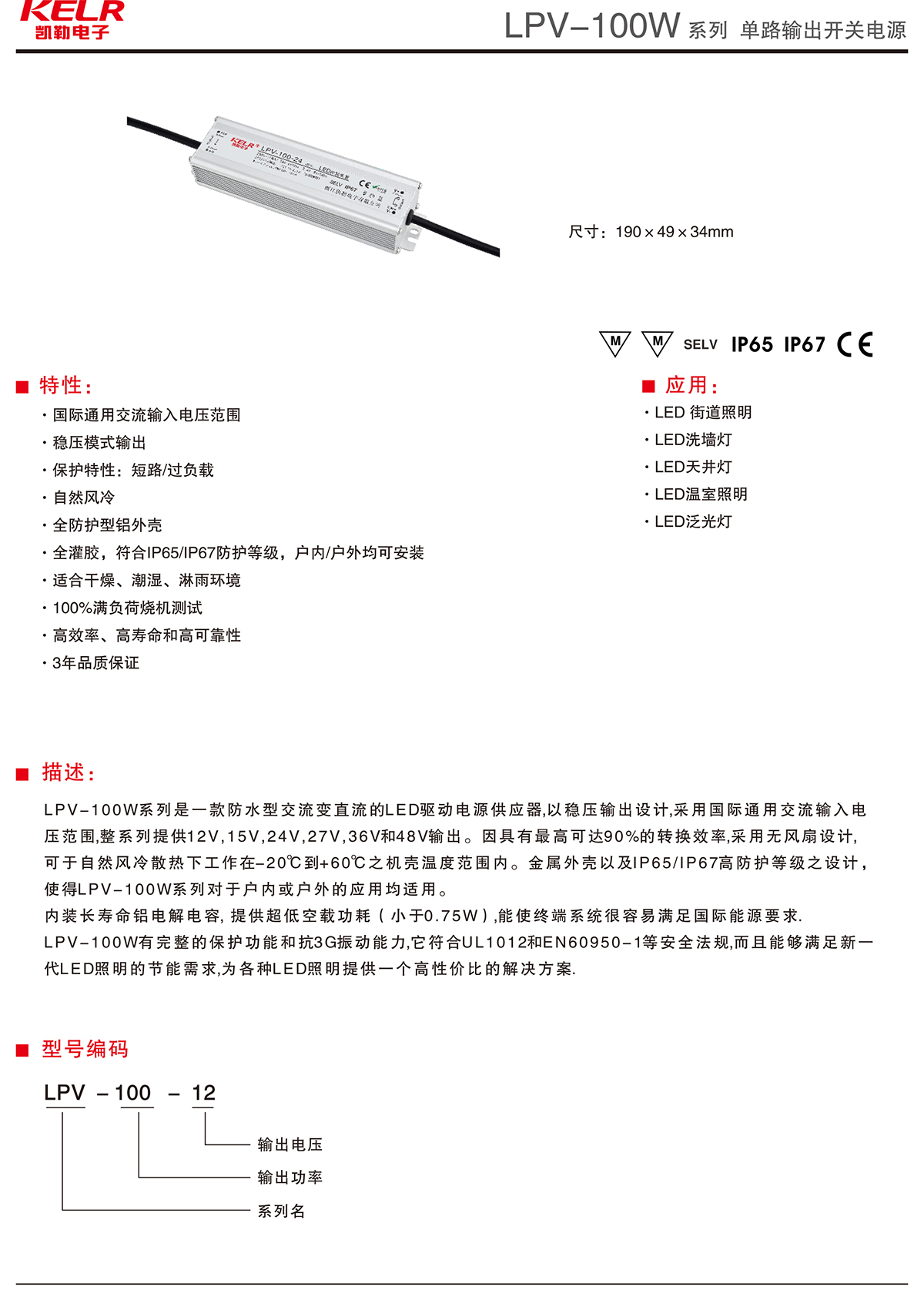 LPV-100-12 系列 單路輸出開關電源
