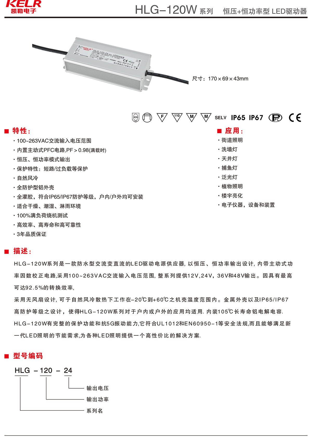 HLG-120-24 系列 恒壓+恒功率型LED驅動器