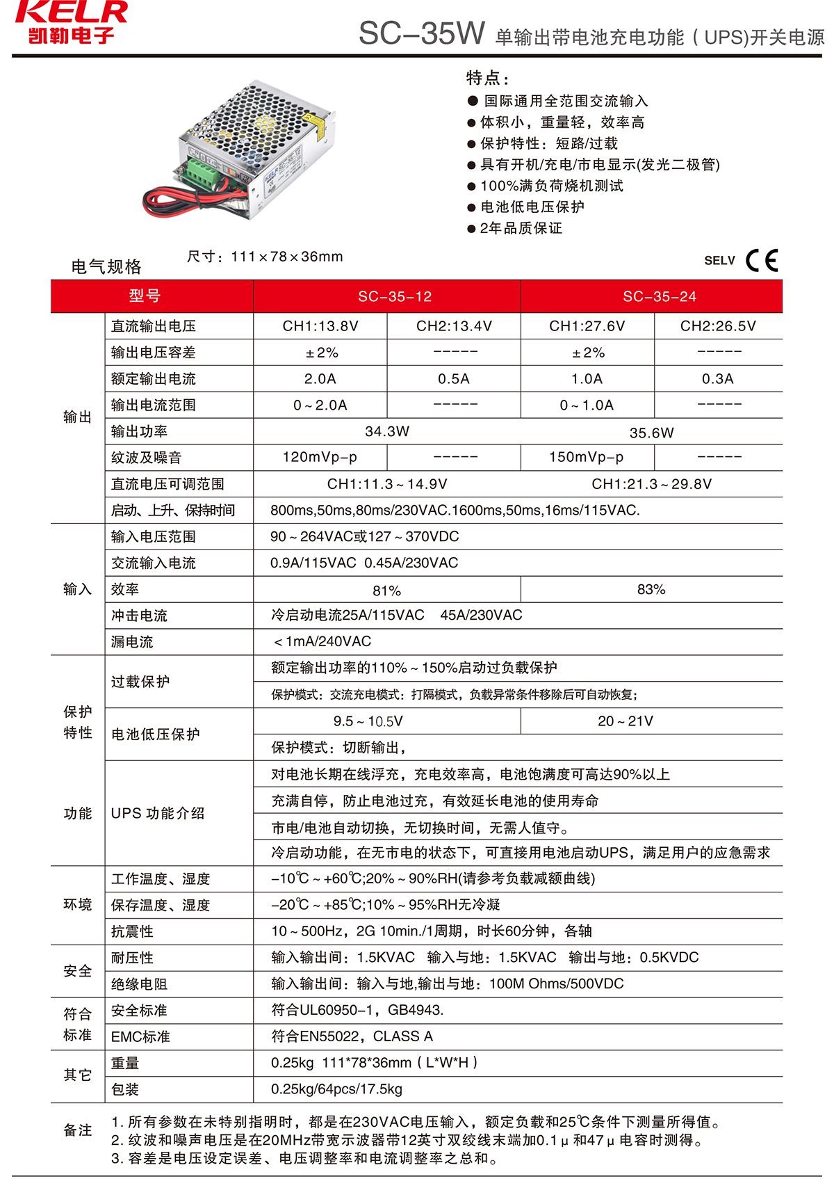 SC-35W 系列 單輸出帶電池充電功能(UPS)開關電源