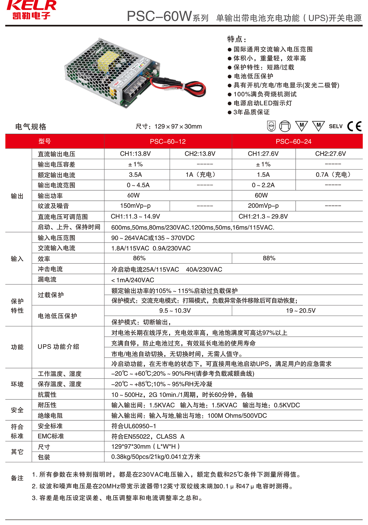 PSC-60W 系列 單輸出帶電池充電功能(UPS)開(kāi)關(guān)電源